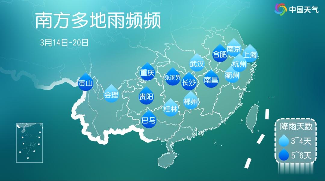 预计15日至17日,西南地区东部到长江中下游一带将普遍出现小到中雨,局地有大雨。之后,18日至20日,雨带还会进一步南压至江南、华南北部一带。