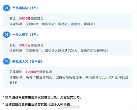 近日,2026崇明森林睡眠挑战赛正式开启全网招募。比赛将于3月21日-4月26日每周六、5月2日、5月3日在东平国家森林公园举行,报名费用为299元。参赛者需全程躺在标准床铺上,可以翻身,不强求一定睡着,闭目养神、静卧发呆等静止的休息行为都可以,严禁服用任何帮助入睡的药物。在比赛中综合“睡眠评分”最高者可获3000元睡眠基金;最快进入睡眠状态的人可获2000元睡眠基金。根据比赛流程,12:00-19:00为睡眠挑战时间,所有严格遵守规则、坚持到最后的选手,可共同瓜分10000元大奖。@上海崇明