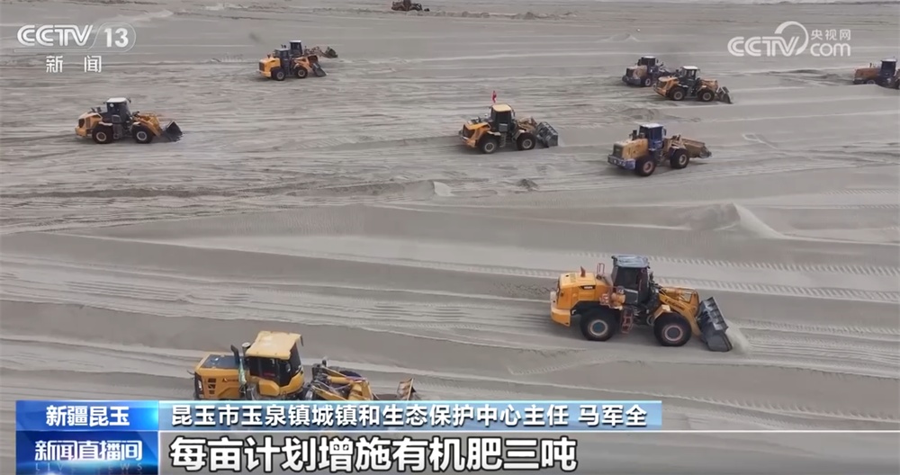在新疆昆玉市玉泉镇的平沙现场,推土机、挖掘机在沙海间穿梭作业,将起伏的沙丘逐一推平,规整成片。针对沙漠缺水、土壤贫瘠的现状,当地同时启动沙漠平整与滴灌管网建设、土壤改良等工作。