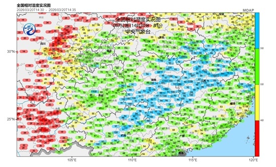 △20日下午,湖南、江西等多地相对湿度达到100%。