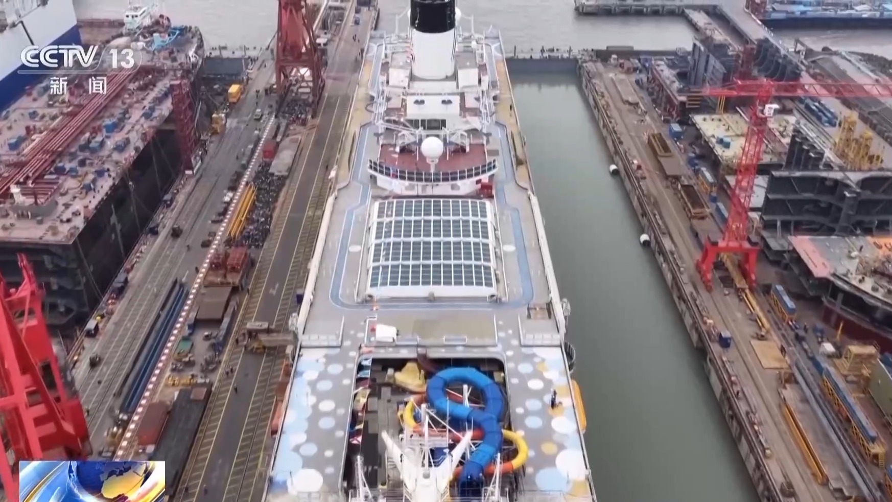 中船集团外高桥造船邮轮项目部副部长张强:出坞时间点的选择,其实最主要的因素还是根据潮水。选择最高潮位,而且是一个平潮位,潮水不再变化了,这个时候水流是最稳定的,确保整个船的安全。