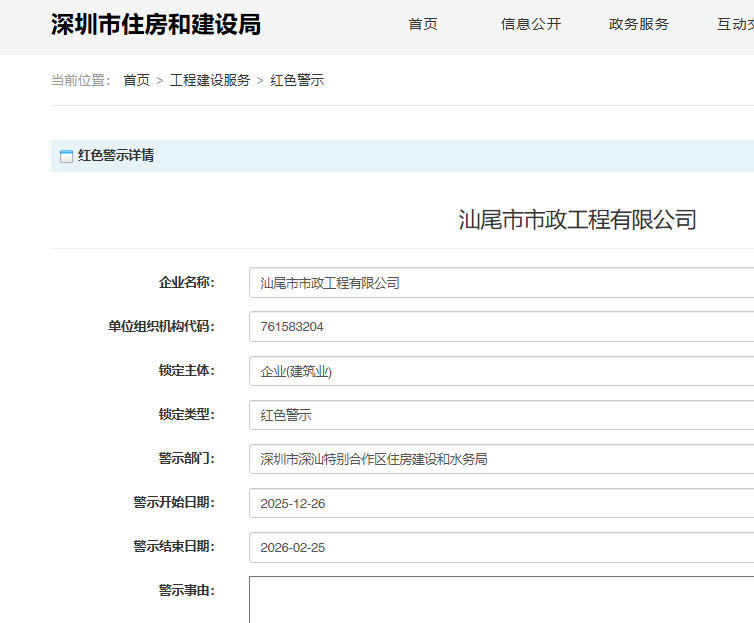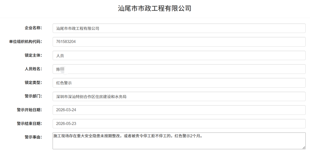 奥一新闻注意到,深圳市住房和建设局日前公布一则红色警示:汕尾市市政工程有限公司及一名相关人员因施工现场存在重大安全隐患未按期整改,或者被责令停工拒不停工,被深圳市深汕特别合作区住房建设和水务局处以红色警示2个月,警示期自2026年3月24日至5月23日。