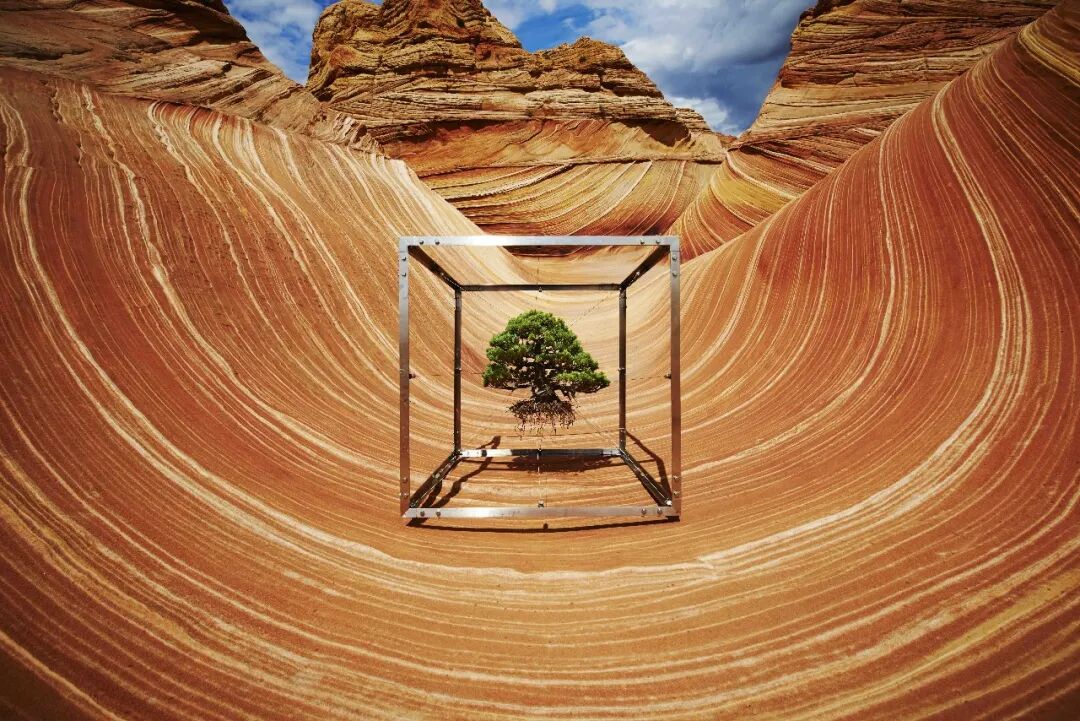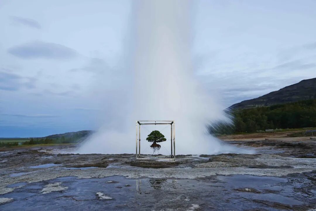 10年来,东信将“四季”带到了世界各地的戈壁荒滩、冰川深海……另一个在极端环境下的尝试是《四季》。从2015年起,我开始带着一棵名叫“四季”的五针松环游世界。我把松树做成盆栽,再固定在一个一米高的立方体金属框架内,带它去了冰岛、美国、比利时、保加利亚、日本等不同国家,体验极端环境,有极地壮阔的冰原,寸草不生的沙漠,也有一望无垠的雪地……每次我们搬运“四季”,和它一起穿越、拜访严酷的无人之地,都有一种特别的生死无常的感觉。