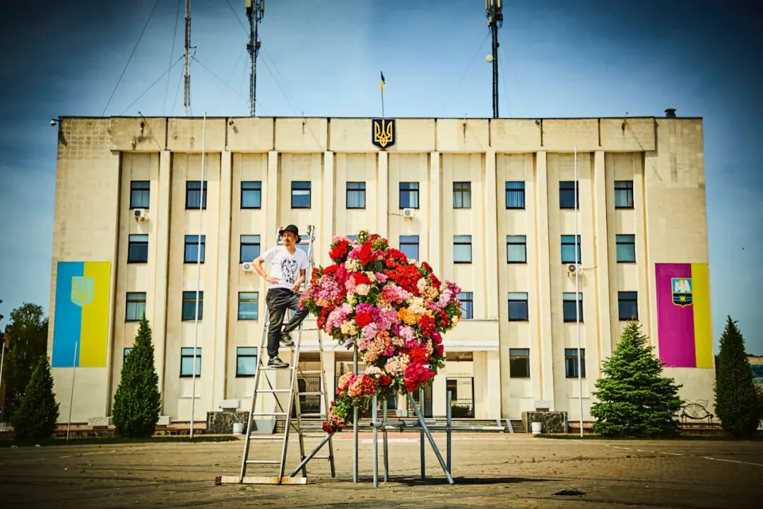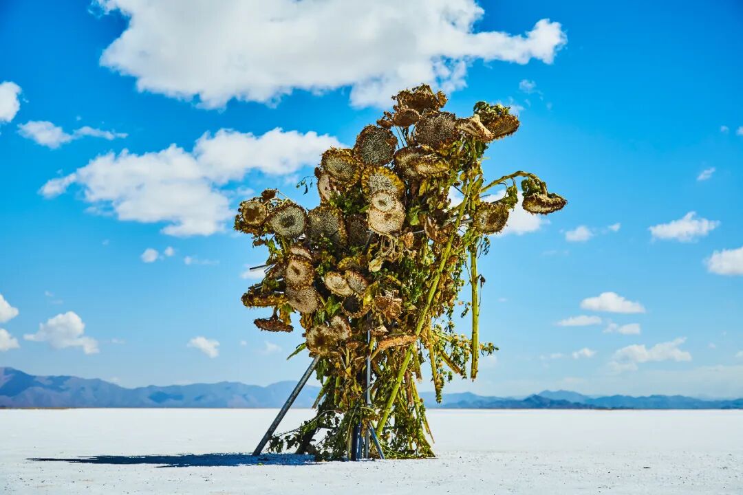 2018年,东信以当地取材的干向日葵为原料在阿根廷的盐湖上创作了一座3米高的植物雕塑不仅是把“四季”带到世界各地,我也尝试在世界各地搭建“植物雕塑”,像曼谷的市集、乌克兰的街区、阿根廷的盐湖……我会选用大量当地的花卉,用切花制作。切花生命无比短暂,所以从构思到完成,仅一两天。在我同花和植物打交道的这些年里,我会周游各个国家。展出结束后,我通常会把花分给当地的居民,然而尽管语言不通,大家在收到花的时候,还是会露出真诚的笑容。就算是治安不太好的地方,也不会有危险的想法,这个过程非常纯粹,我想这就是花的力量吧。