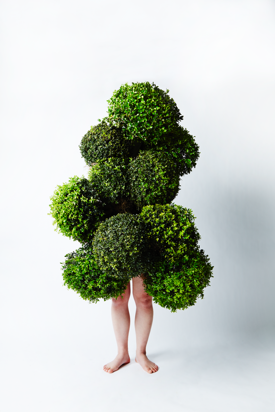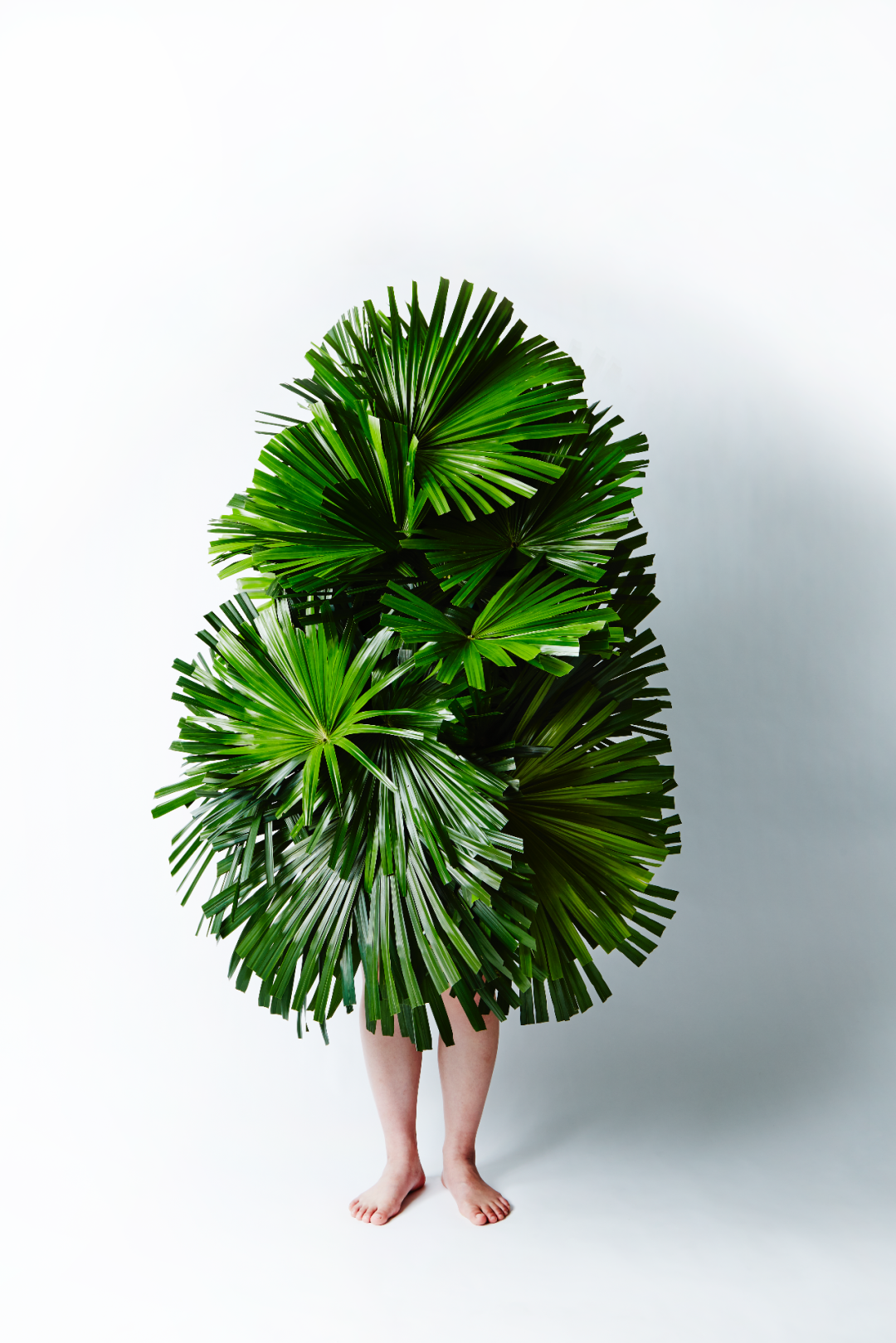 东信于2015年创作的《树叶人》有段时间我非常忙碌,总是被工作追赶着,我梦见自己变成了“树叶人”,身上裹满叶子站在店里,我在这样的梦中惊醒了,于是便开始尝试着把脑海里保存的形象变成具体的作品。但有趣的是,自从我把“树叶人”变成作品后,它就再也没出现在我的梦里了,所以新的“树叶人”很难诞生了。还有人会叫我“朋克花艺师”,可能因为我的作品风格和思考方式有非常激进的地方。但我所理解朋克,并不是指反抗,而是总是对自己不满足,总是追求某种东西,总是将自己独有的“现在”破坏掉,再创造新的东西。可能对于花这种载体来说,一旦做出来就是过去的东西了,所以还是要不断创新。我总是对自己说:“下次再做体量更大、更有趣的东西吧”。我常常想象,如果科技发展到我们可以轻易登上月球了,穿着宇航服在月球上插花,又会呈现出怎样的景象呢?用这种方式,通过花和植物来创造人们从未见过的世界,我想这大概是我的使命吧。