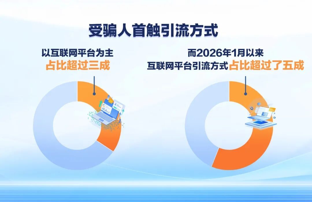 通过案件深入分析发现,首触引流方式(诈骗分子接触潜在受骗人的第一道关口)以互联网平台为主,占比超过三成,具体方式包括社交软件私信聊天、短视频评论、APP广告等。电话、寄递小卡片、网络游戏、短信等引流方式位列2到5位。而今年1月以来,互联网平台引流方式占比超过了五成。