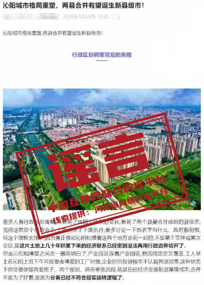 详情:近日,某平台账号发布标题为“沁阳城市格局重塑,两县合并有望诞生新县级市”的文章,称“焦作市的沁阳和博爱要合并成新的县级市”,引发关注。经核实,相关网传消息毫无事实依据,系账号主办者为博取关注、吸引流量而编造的虚假信息。河南省焦作市网信办已责令账号主办者删除相关信息,并对其进行了批评教育。(来源:“清朗河南”微信公众号、焦作市互联网举报和辟谣平台)