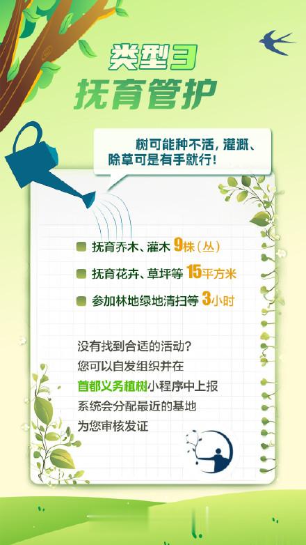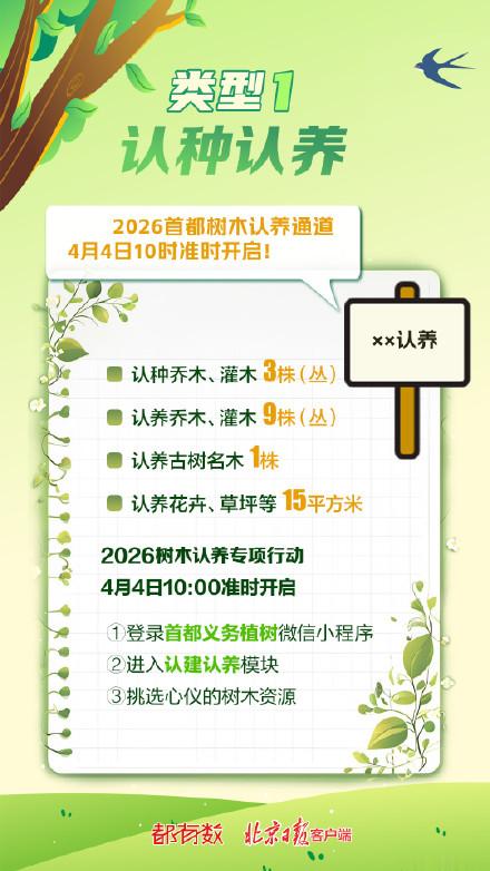 首都树木认养通道今日10时开启!每年种3棵树的“作业”您完成了吗? 作者: • 更新时间:2026-04-04 23:30 • 4月4日是第42个首都义务植树日,本市将于10时集中公布一批古树名木和优质景观树木资源,面向全体市民公开认养。如何选到自己心仪的树木?除了认养“冠名”之外,还可以通过哪些形式履行每年种3棵树的植树义务? 本文内容由互联网用户自发贡献,该文观点仅代表作者本人。如发现本站有涉嫌抄袭侵权/违法违规的内容,请发送邮件至 203304862@qq.com 本文链接:https://www.jinnalai.com/jingyan/820023.html