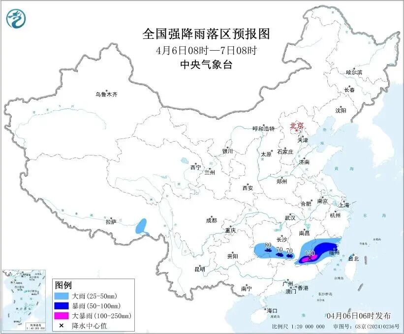 中央气象台预计,4月6日至7日,江南、华南等地有中到大雨,局地有暴雨或大暴雨,并伴有强对流天气。