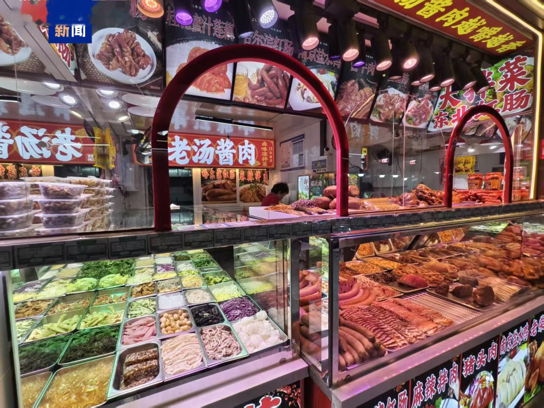 部分档口还使用不同颜色的照明灯,例如一家熟食档口,凉拌菜上方使用的是类似紫色和白色的照明光源,而旁边的熟食托盘上方则是暖黄色的光源,让不同菜品呈现不同质感。