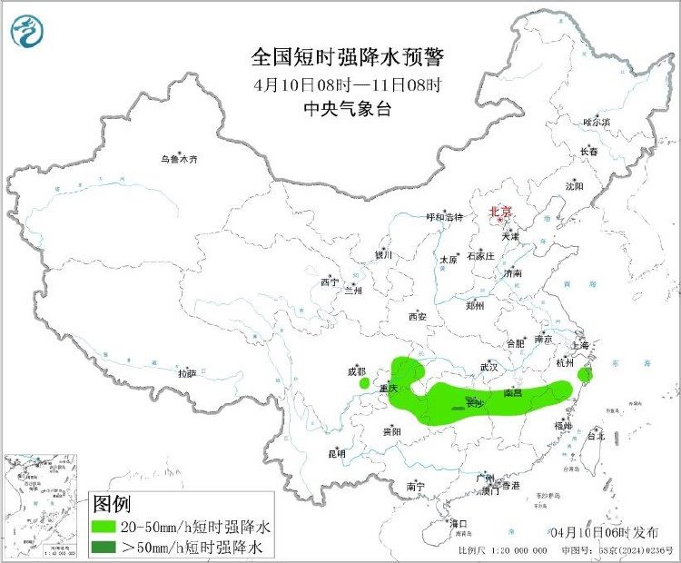 中央气象台继续发布暴雨蓝色预警:预计,4月10日8时至11日8时,湖北南部、湖南中北部、江西中北部、福建西北部、重庆中部、贵州东北部、四川中部等地部分地区有大到暴雨,其中,湖南中部等地部分地区有大暴雨(100~110毫米)。上述部分地区伴有短时强降水(最大小时降雨量20~40毫米,局地可超过50毫米),局地有雷暴大风或冰雹等强对流天气。
