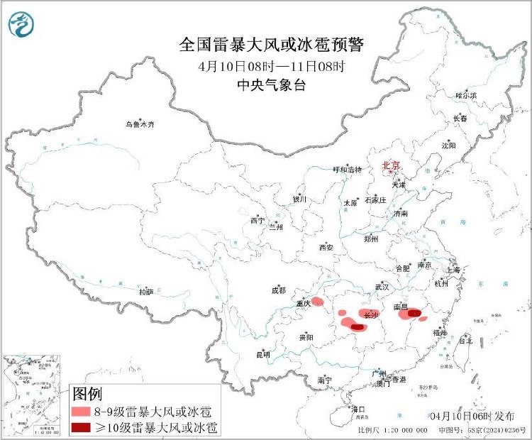 中央气象台继续发布强对流天气蓝色预警:预计4月10日8时至11日8时,江南中部等地的部分地区将有8级以上雷暴大风或冰雹天气,其中,湖南中南部、江西中东部、福建西北部等地的部分地区将有10级以上雷暴大风,最大风力可达11级以上;江南中部、西南地区东北部等地的部分地区将有小时雨量大于20毫米的短时强降水天气,其中,湖南中部的部分地区小时雨量大于50毫米。
