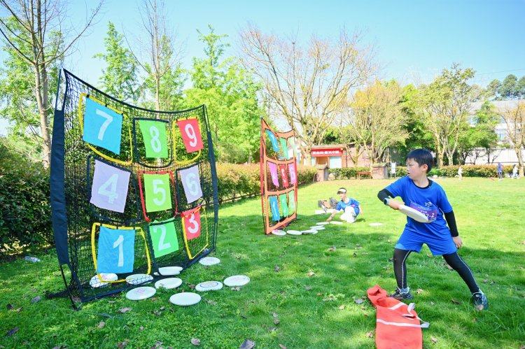 小朋友参加飞盘九宫格项目。