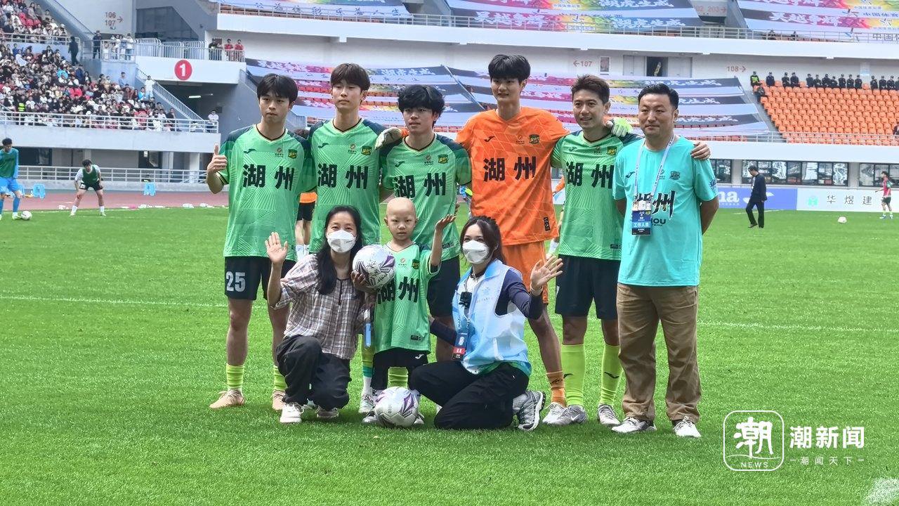 湖州队的球员们送上签名足球,瑞瑞开心地和看台的观众们招手。这一刻,那个小小足球少年的心愿,终于实现了!