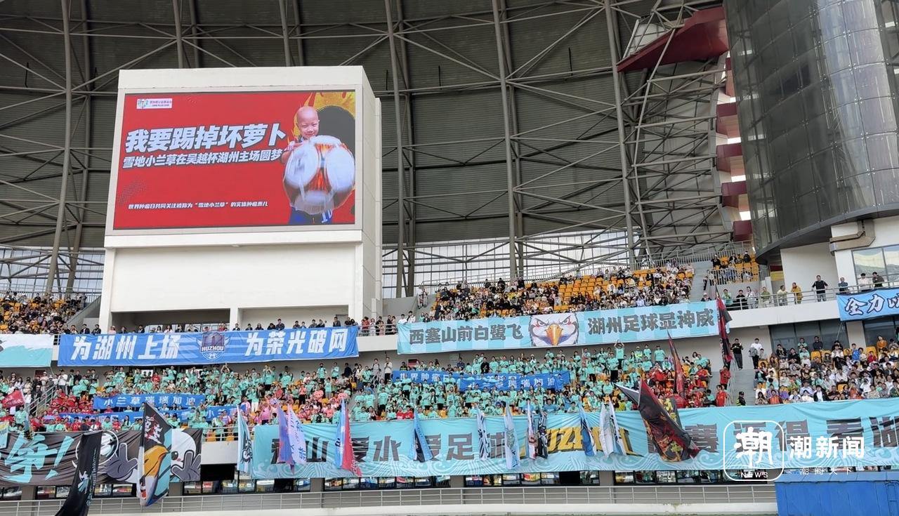 现场大屏上,亮起温暖的祝福语:“我要踢掉坏萝卜雪地小兰草在吴越杯湖州主场圆梦”“祝福小勇士瑞瑞吴越杯绿茵圆梦”。