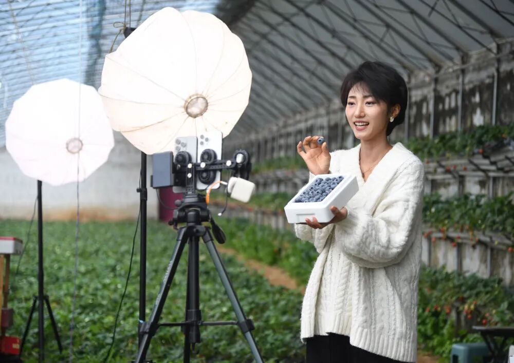 在北京市平谷区山东庄镇鱼子山村一处设施农业基地的大棚内,工作人员直播销售蓝莓。新华社记者任超摄