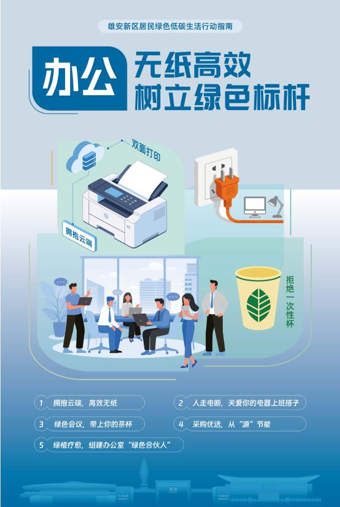 雄安新区作为“数字孪生城市”,全面推广智慧政务与绿色办公模式。依托领先的数字基础设施,倡导各机关、企事业单位及员工,将绿色理念融入日常办公,共同打造高效、低碳的“未来办公”雄安样板。