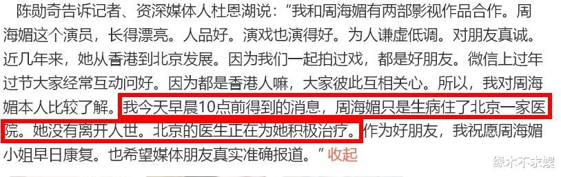 其中周海媚的好友、知名导演陈勋奇更是笃定周海媚没有去世。