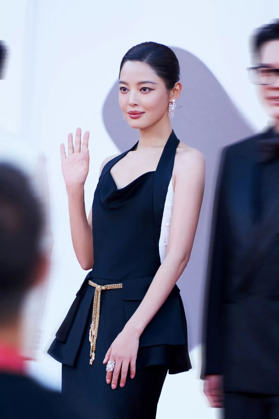在威尼斯电影节红毯上,她身着黑白撞色挂脖长裙,搭配正红色口红,利落的盘发露出精致的脖颈线条,唇色与礼服的黑色部分形成呼应,既凸显了东方女性的肤色优势,又让整体造型充满 “攻击性的优雅”;