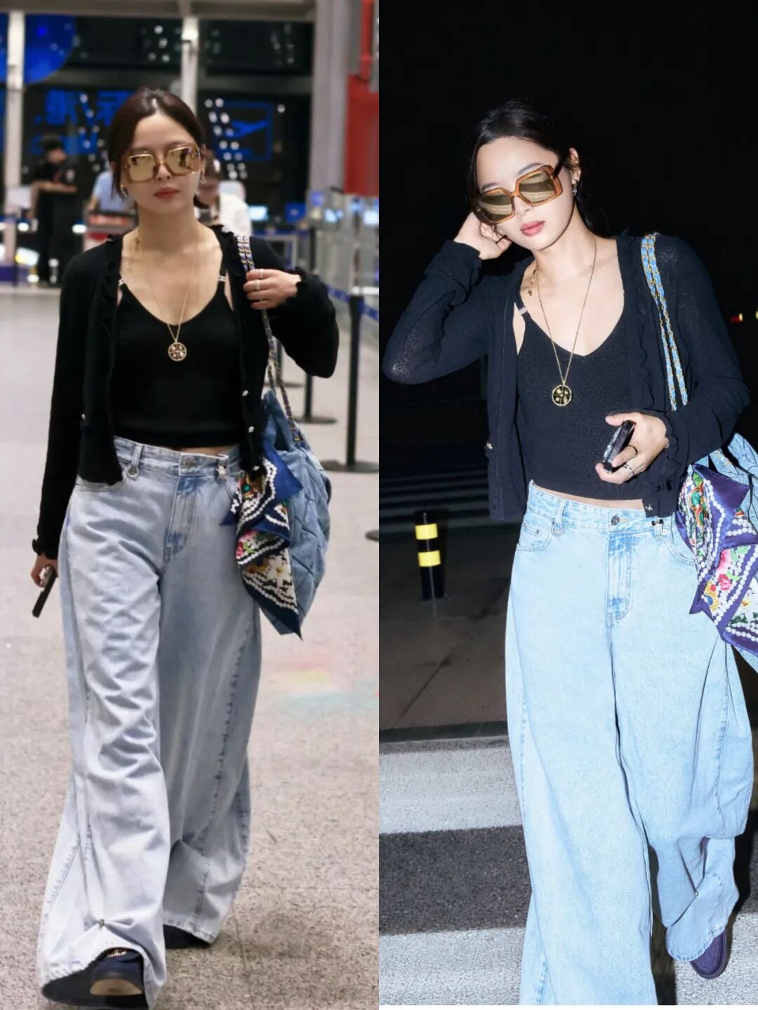 入秋的针织衫穿搭,也可以这样“香”!辛芷蕾身穿黑色针织开衫,内搭针织吊带,搭配黑色阔腿牛仔裤,小香风穿出女强人的气场!!