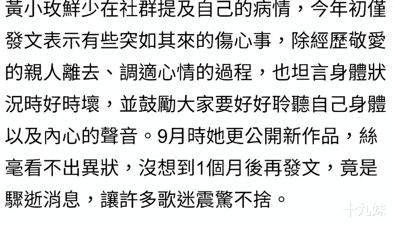 谁曾想,命运从来喜欢捉弄人。今年年初,黄小玫曾在社交平台透露,自己正经历亲人离世的悲痛,身体状况也时好时坏,还特意提醒大家 “好好聆听身体以及内心的声音”。当时无人知晓,现在才知道这应该是她与罕见癌症抗争的开端。团队后来透露,黄小玫患的是细胞淋巴癌,治疗过程异常艰辛,但她始终保持积极心态,直至生命最后一刻都在勇敢奋战。