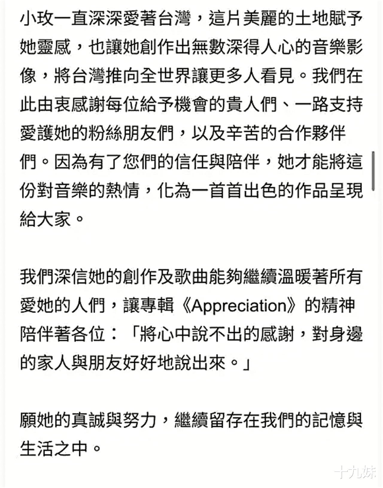 这是台湾籍歌手黄小玫的专辑《Appreciation》(又名《说不出的感谢》)中,所要表达的中心思想。没想到,这句话竟成为她留给我们的临终寄语。