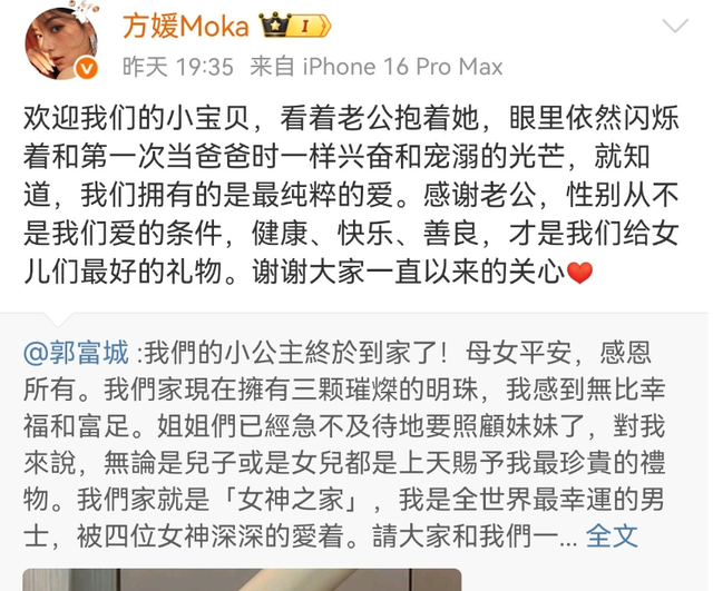 很期待看到他们一家五口同框的幸福合照,也再次恭喜郭富城方媛再度荣升父母。