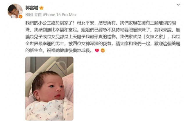 近日,知名男星郭富城在社交平台正式官宣三胎女儿出生,并开心晒出了女儿的正面照。郭富城特别强调:“对我来说,无论是儿子或是女儿都是上天赐予我最珍贵的礼物,我们家就是女神之家。”还欢呼自己是全世界最幸运的男士,被四位女神深深爱着。