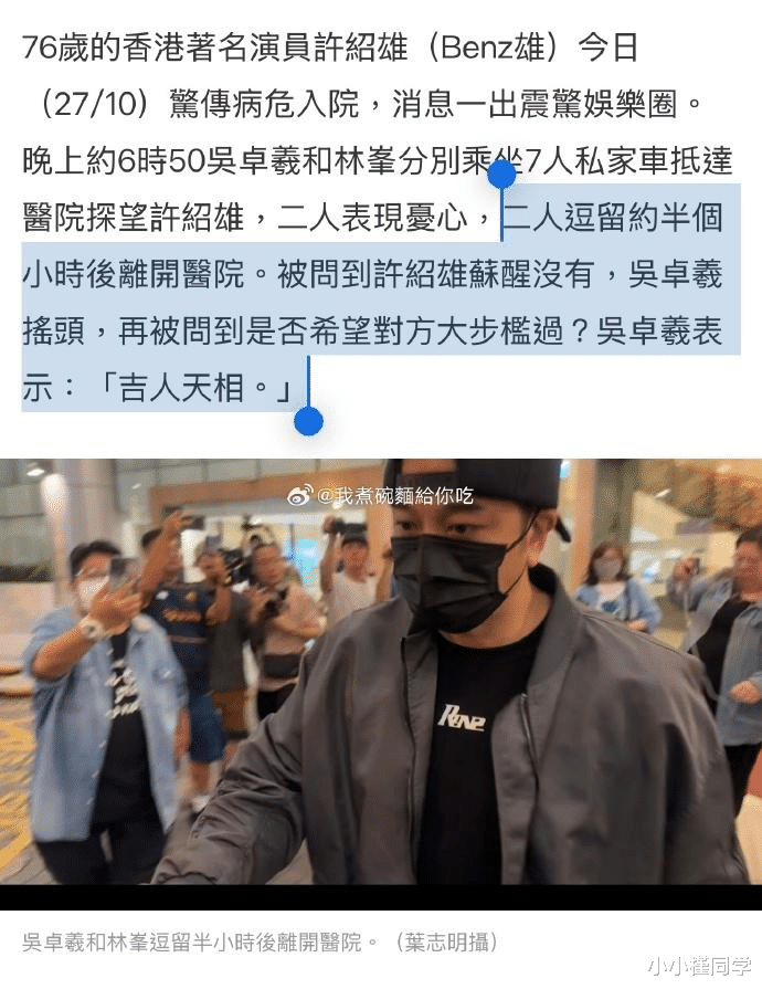 香港许绍雄(Benz 哥/欢喜哥)近日传出病危入院,消息一经曝光,立刻震动整个演艺圈,并在网络上引发热议。女星佘诗曼在出席活动时被媒体问及许绍雄的健康状况,一度哽咽、眼含泪水,难掩内心的关切。同时,香港媒体记者也守候在医院门外,拍摄到多位艺人前往探视。