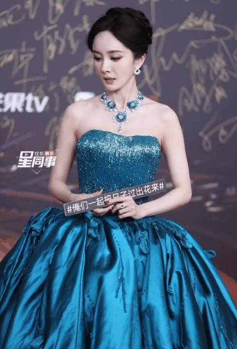 一袭湖水蓝抹胸长裙搭配同色系珠宝,褶皱蓬松的裙摆让杨幂看着更加贵气。