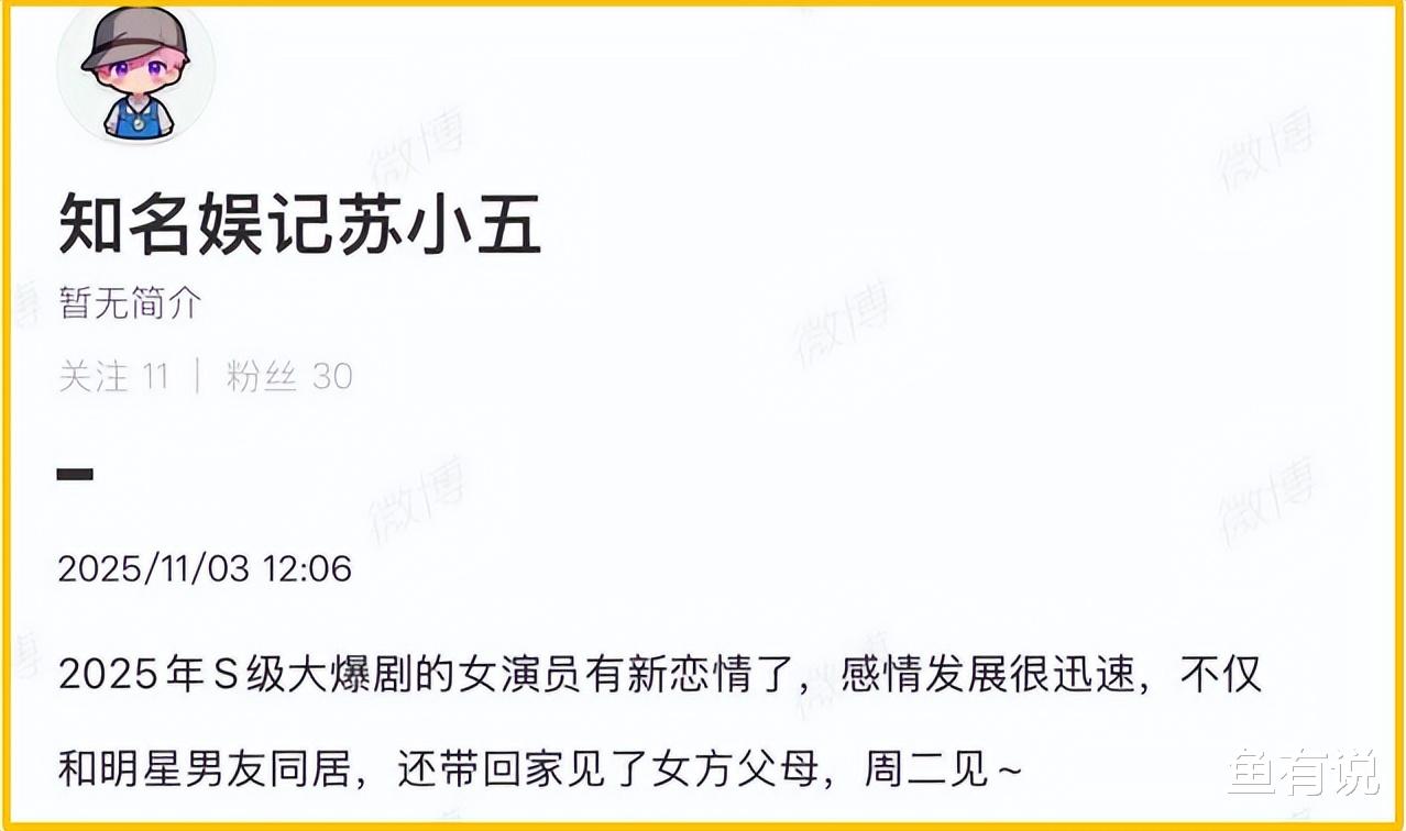 蒲熠星晒收益辟谣时,又有狗仔凑热闹预告,称S级大爆剧的女演员有新恋情了,并且还进入了同居阶段。