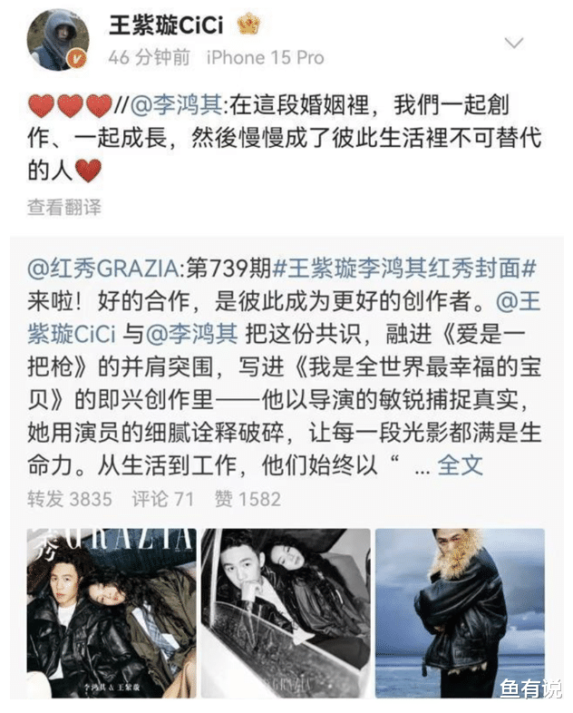 剩下的就是前排吃瓜李鸿其,在威尼斯电影节上公开告白,而小两口也非常慷慨的借着着杂志合体,官宣了结婚消息。