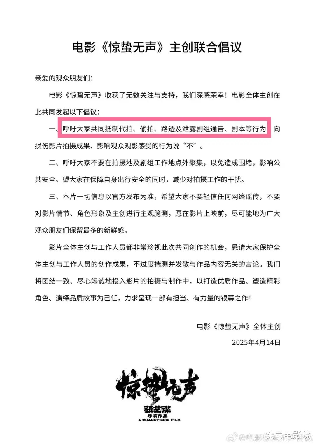 今年4月14日,影片官宣开机的同时,还发布了主创联合倡议,坚决抵制代拍、偷拍等行为,呼吁保护创作隐私。
