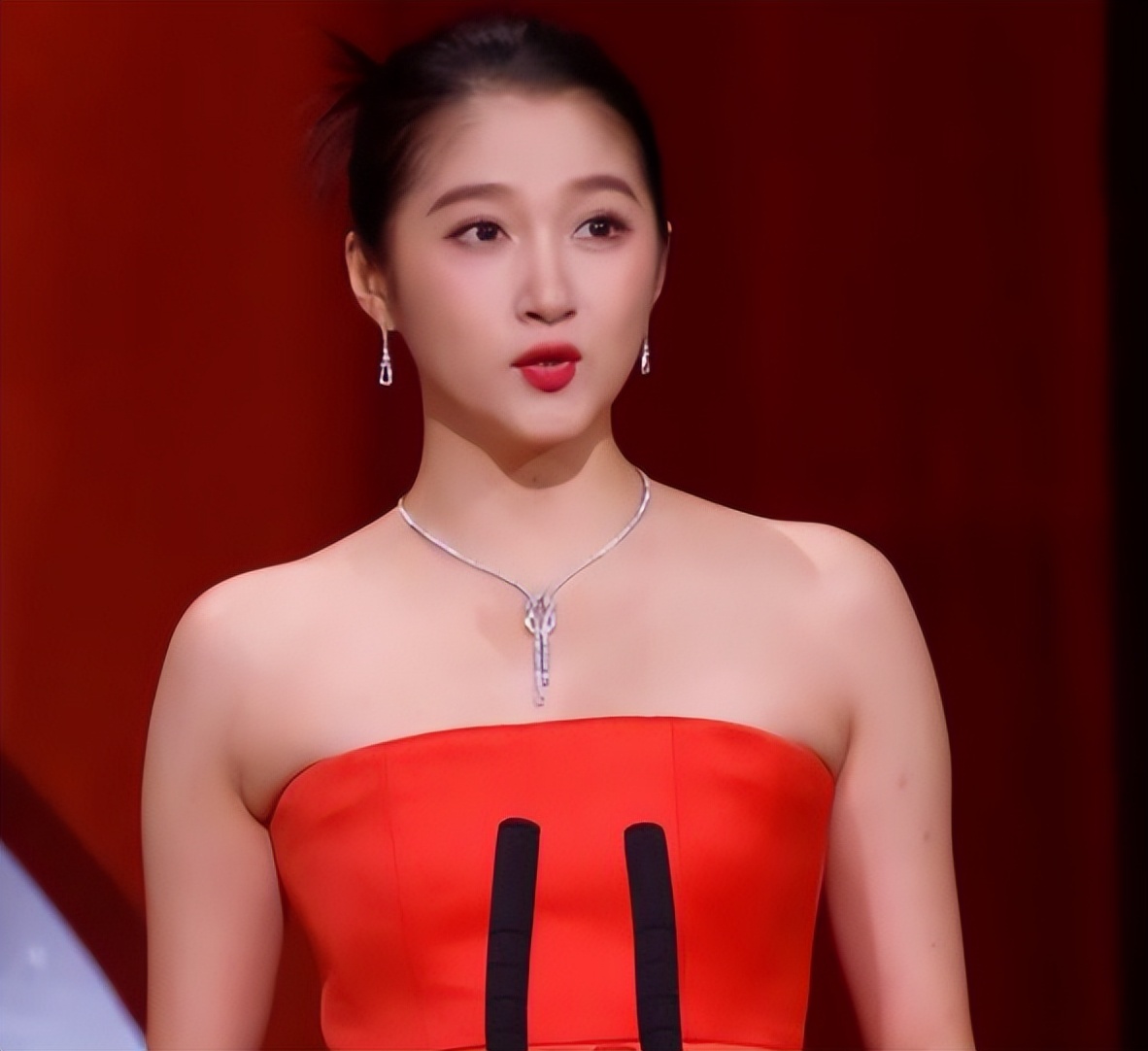 内场中,关晓彤又换了另一套装扮,大红色的抹胸礼服比较大气,但凡换一位中年女演员都能驾驭得了。