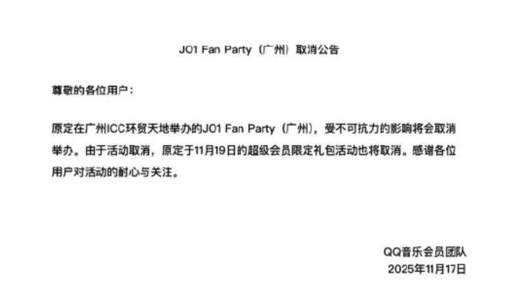 17日晚,QQ音乐在社交网站上发布一则公告称,“原定在广州举办的JO1FanParty,受不可抗力的影响将会取消举办。”