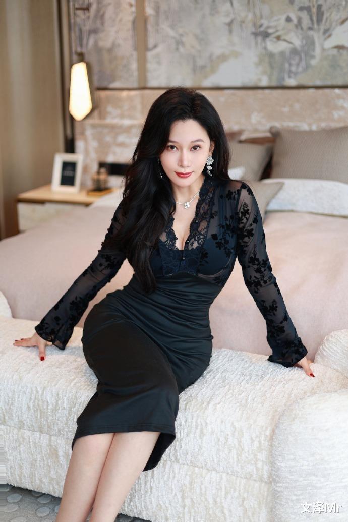 何雨桐优雅地坐在白色毛绒沙发上,这身黑色连衣裙的剪裁堪称完美——上半身蕾丝的性感与下半身丝绸的端庄结合得天衣无缝,将她标准模特身材勾勒得淋漓尽致。背景中温馨的卧室布置,如同她个人风格的延伸。她眼神自信从容,一手轻搭沙发,仿佛在宣告:这就是我的世界,我的风格。从颜值到身材,从穿搭到生活场景,何雨桐成功地塑造了一个立体、迷人且极具辨识度的时尚ICON形象。