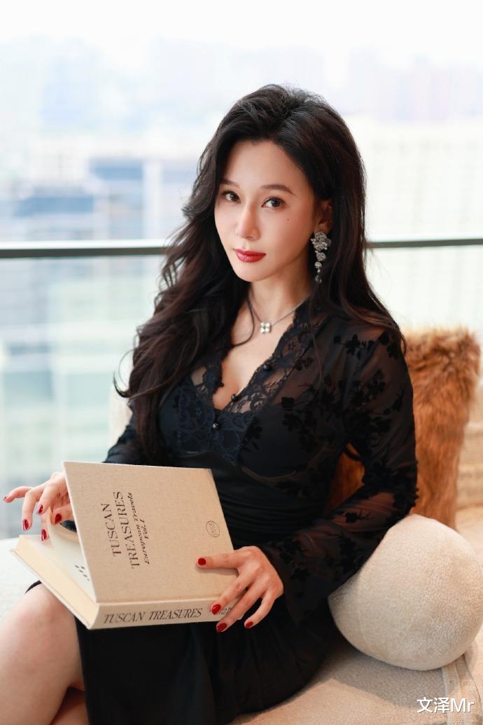 阳光透过巨大的落地窗,为整个空间铺上一层柔光。何雨桐慵懒地陷在浅色沙发里,一袭深V黑色蕾丝长裙勾勒出她曼妙的身姿。乌黑的长发、精致的上扬眼线,以及那一抹标志性的正红唇色,在柔和光线下更显妩媚。她手中那本书籍,不仅是画面的点缀,更暗示着她内在的品味与追求。锁骨链与耳饰闪烁间,她仿佛一位从都市繁华中抽离的现代贵族,优雅、闲适,又带着一丝不容忽视的性感张力。这一刻,智慧与美貌在她身上达成了完美的平衡。