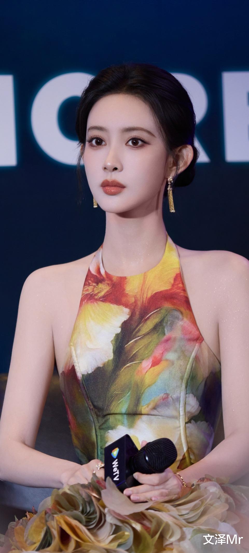 裙子的正面花纹更绝:黄、红、绿的撞色像莫奈的《睡莲》,但饱和度压得很低,不会显俗反而衬得她气色更暖,挂脖领口露出的锁骨窝,是 “不经意的性感” 最好的注解。