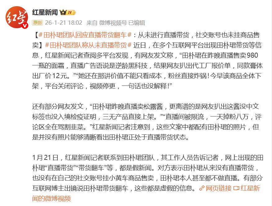 据团队澄清,田朴珺从来没有进行过直播带货,也从未在自己的任何社交账号上挂过“小黄车”之类的商品链接,更绝的是,团队透露田朴珺本人甚至根本就不做直播。那些流传的所谓“直播截图”和“翻车现场”,被指是断章取义或恶意拼接的产物。至于部分博主有模有样出镜讲述的“翻车故事”,团队直接定性为“虚假信息”,并强调已对相关不实内容采取法律手段,准备硬刚到底。
