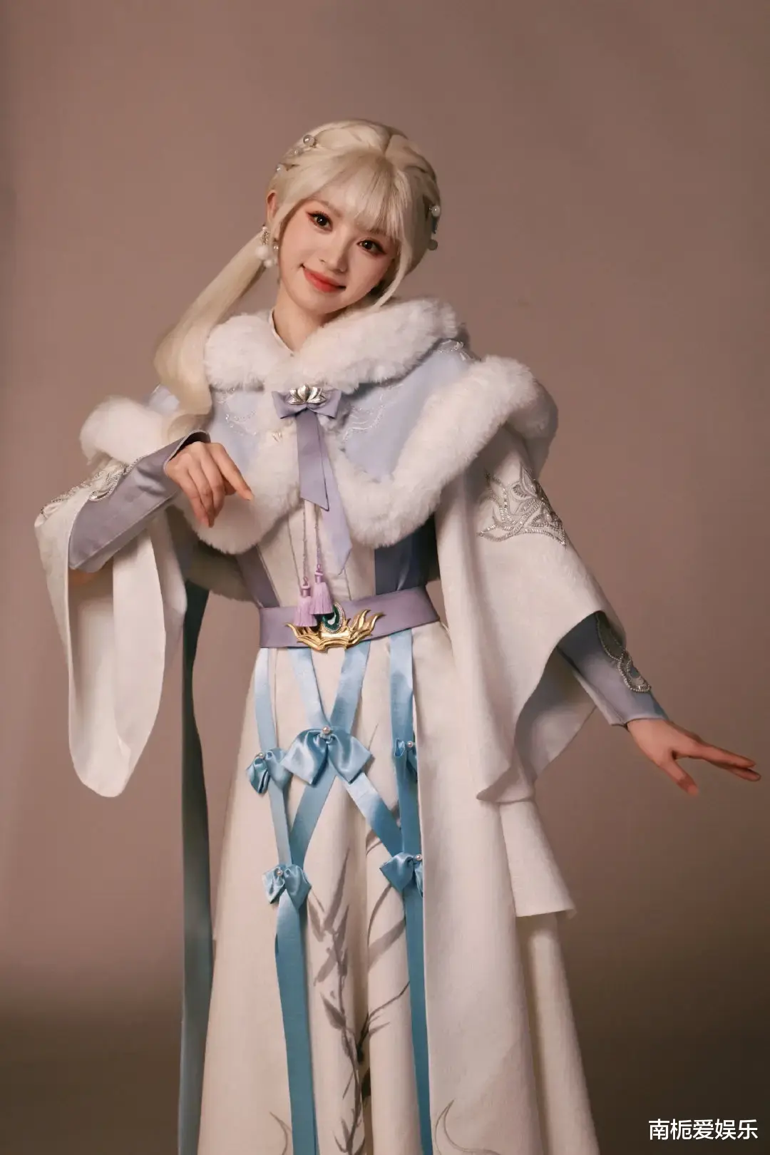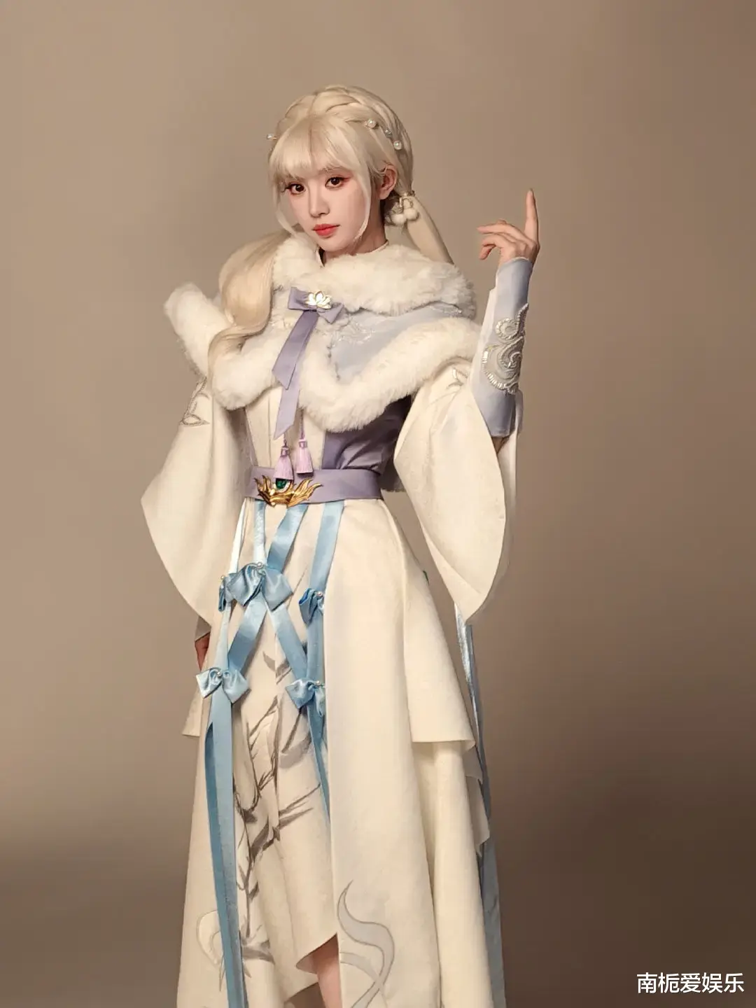 这组造型的灵感源于《和平精英》的虚拟角色设定,田曦薇以COS形式演绎了一位兼具甜美与战斗力的“甜酷狙击手”。她身穿古风白色长裙套装,外搭毛绒领斗篷,整体造型利落又不失少女感。妆容走极简裸感路线,弱化色彩却突出五官立体度。白发不仅衬得她肤白胜雪,更与灵动双马尾形成强烈反差,甜而不腻,飒而不冷。