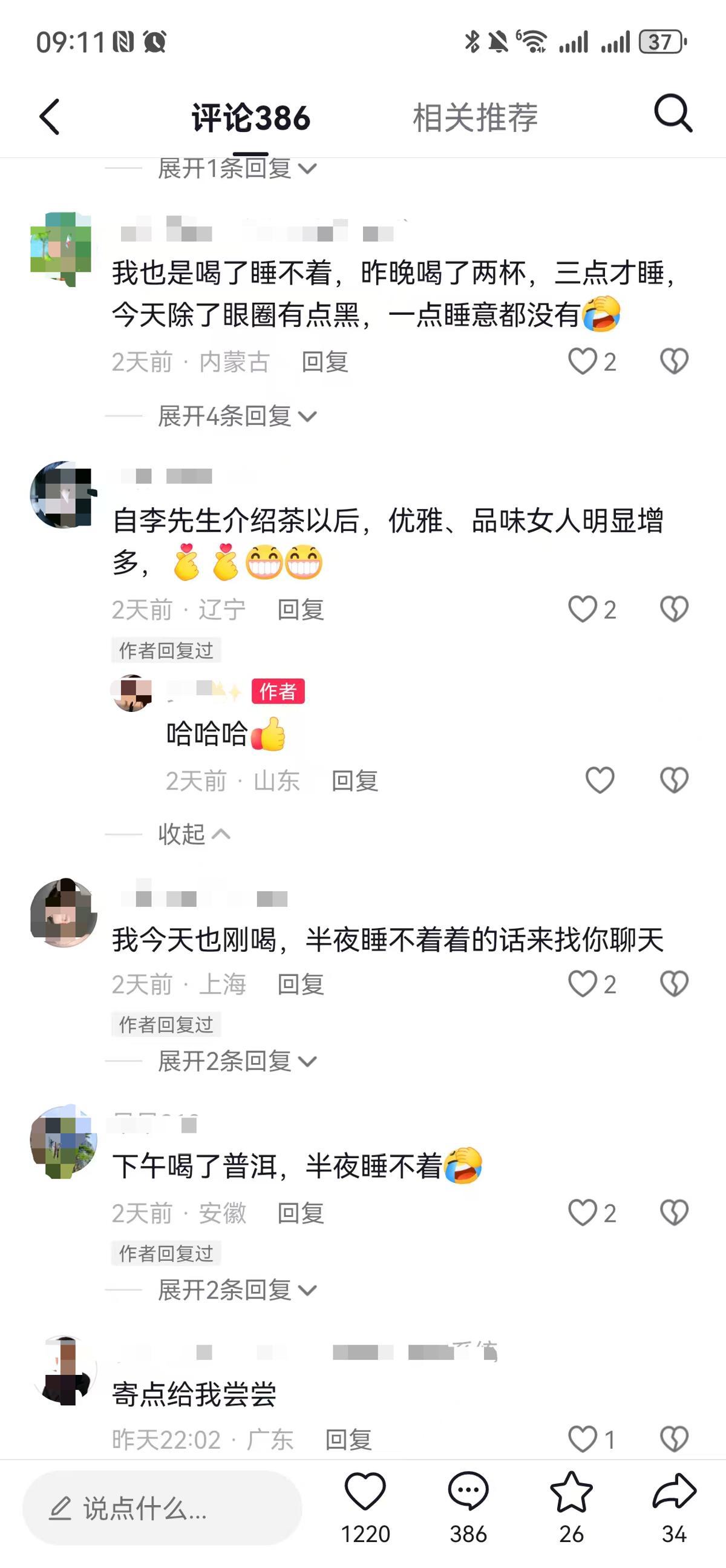 这些天,在社交平台,不少网友晒出自己在李亚鹏直播间抢到的茶叶。“喝了李亚鹏的茶,凌晨两点都睡不着,支持鹏哥,起来接着喝。”河南一位网友称,本来不喝茶,为了支持李亚鹏抢了盒茶叶,晚饭后泡了喝,一直睡不着。网友在评论区称“哈哈哈,原来不止我一个”。