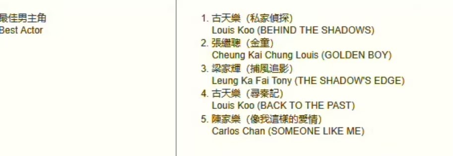 同期的竞争对手,还有张继聪、陈家乐两位港片新秀,以及15次获得提名,4次揽获金像奖的梁家辉。