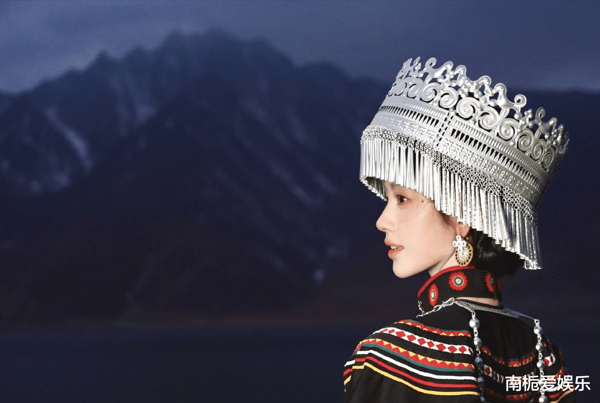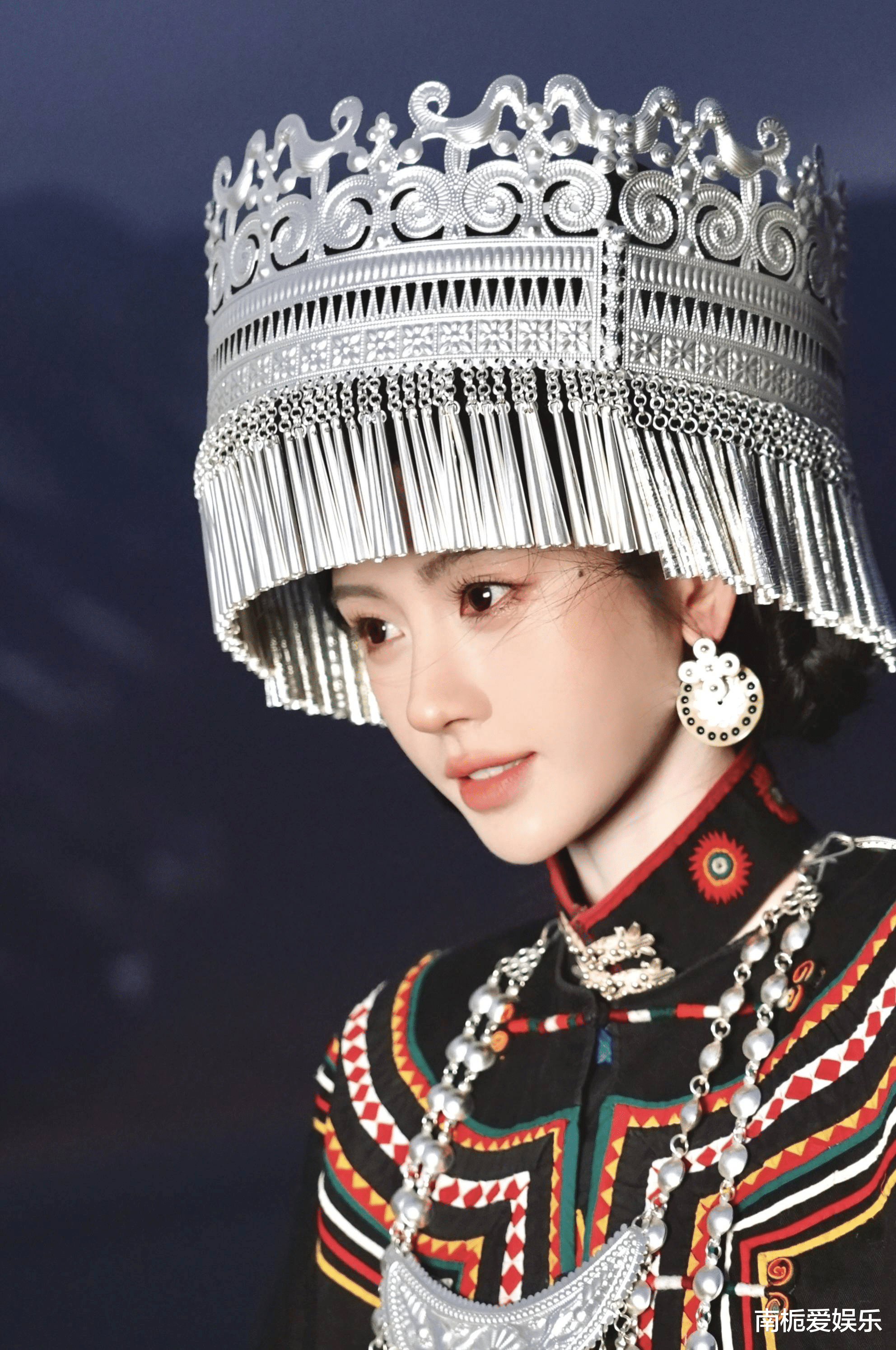 鞠婧祎的服饰严格遵循彝族非遗形制:藏青色窄袖短衫搭配百褶长裙,裙摆密密绣着火镰纹、羊角纹等传统图腾,针脚细密如发丝,还原了彝绣“背面绣花”的精湛技法;头戴重达5斤的银饰冠冕,镶嵌红珊瑚与绿松石,流苏垂肩随步轻晃,完美诠释了“无银不成盛装”的民族审美。最吸睛的是她脸颊上特意打造的“凛冽红晕”,既贴合高原地域特色,又与服饰浓烈的红黑主色调形成呼应。