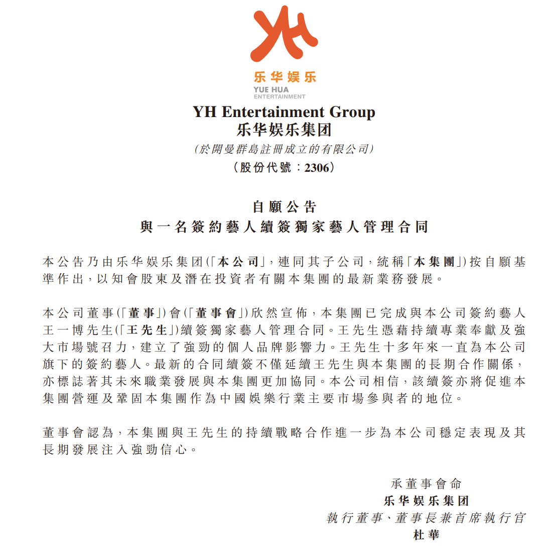 3月27日,乐华娱乐(02306.HK)公告,公司董事会欣然宣布,集团(乐华娱乐与其子公司统称“集团”)已完成与公司签约艺人王一博续签独家艺人管理合同。