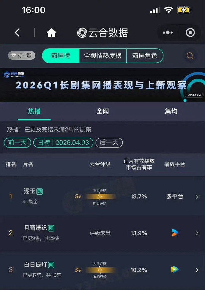 这部剧定档后,碰巧遇到迪丽热巴换经纪人,所以宣传特别给力,提升了好几个档次,最初,这部剧的热度还是不错的,可《月鳞绮纪》开播第三天,就将《白日提灯》挤掉了,冲到榜单第二的位置。