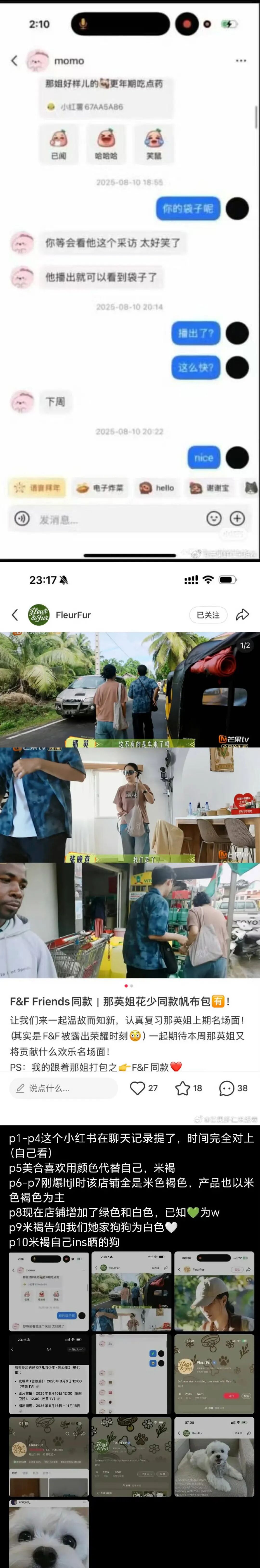 其实这个潮牌的瓜早就有迹可循,此前王一博被泄露的聊天记录里,王一博和綦美合就提到过这个品牌,创立的时间线完全能对上。该潮牌的背景图“骨头元素”,发出来的宠物狗照片都和綦美合早期的社交动态对上了,綦美合喜欢用“米褐”代称自己,该账号主推的产品都是米色、褐色元素;这个账号发过《花少》的品牌包预告,后来那英真的在节目中背了同款包。