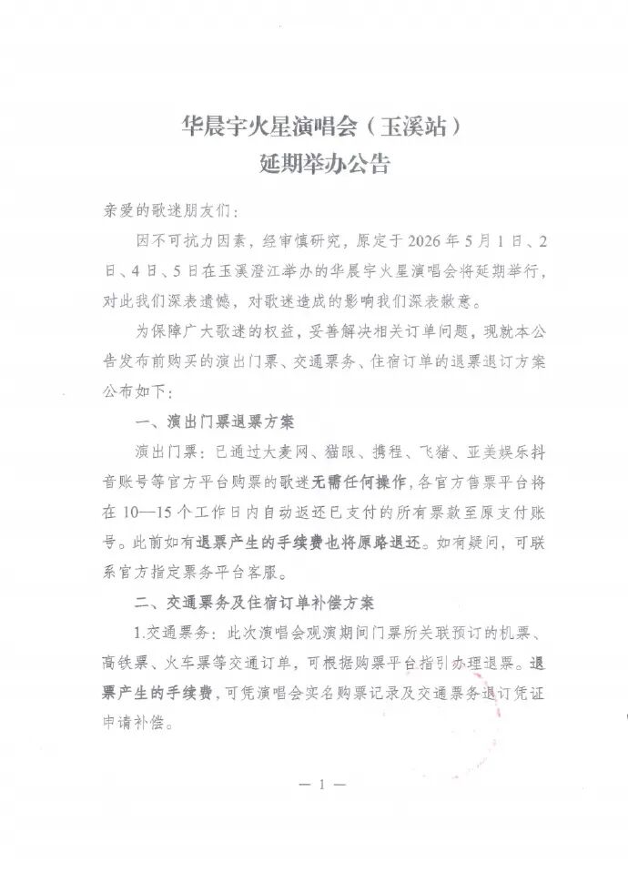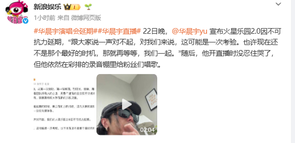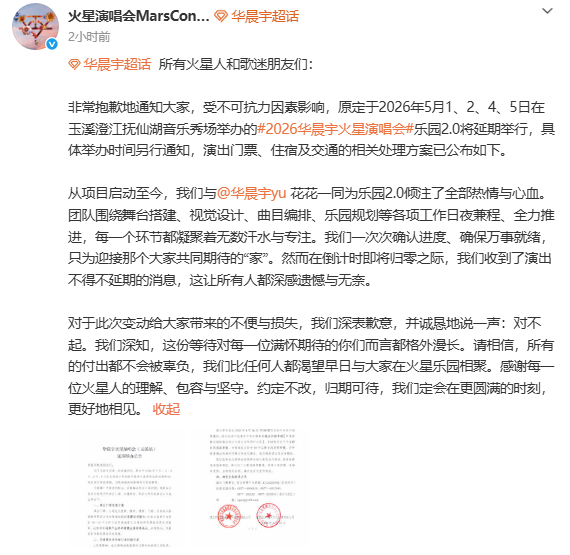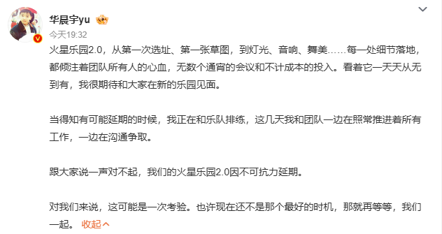 4月22日晚,歌手华晨宇发文致歉,在云南举办的火星乐园2.0因不可抗力延期。