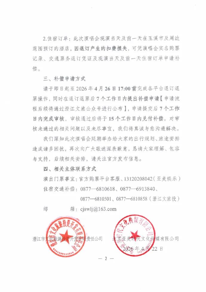 此次演唱会观演当天及前一天在玉溪市及周边范围预订的酒店实际退订手续费,给予补偿。