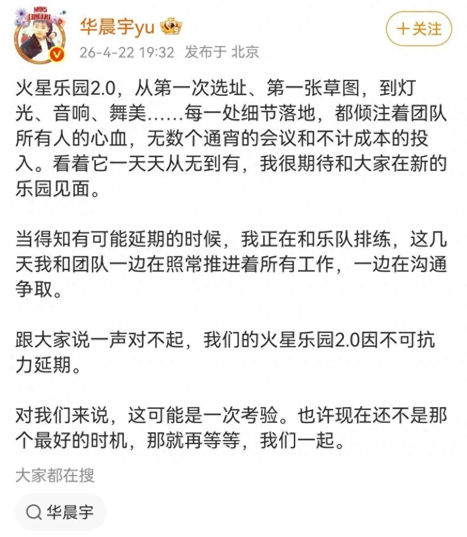 粉丝的解释永远是,他也不知道啊,都是主办方的错。但说这话的人,是不是把华晨宇想得太无辜了?他是这个IP的核心,是“火星乐园”的招牌,演唱会的每一站选址、每一处舞台设计,他不可能不过问。网上都能查到的环保红线信息,他的团队查不到?