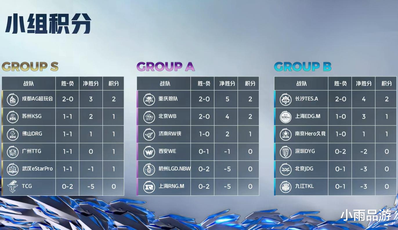目前为止AG拿到了两连胜,是S组唯一一支不败的战队,其他五支战队除了TCG两连败之外,都是1胜1负的战绩。